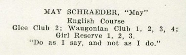 I liked penmanship and had Mrs. Thresher and Mr. Hickey as my teachers in penmanship. While in Mr. Hickey’s class there were contests at Whitewater and I was chosen to compete. We were taken to Whitewater by train and our meals and hotel room paid for. Another girl, Elsie Johnson of Wausau, was also chosen so we were together. None of us won but we enjoyed it.