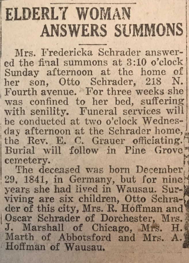 The first home I remember was at 218 North 4th Avenue in the city of Wausau. When I was a baby my parents had lived in an upper flat on North 3rd Avenue but I do not remember living there. My father delivered groceries with horse and wagon for a grocery store called “Cash Trading Co.” on 304 First Avenue South where Palace Clothes later had their store. A man Albert Rapraeger, was one of the owners of Cash Trading Co. and his family had lived at 218 North 4th Avenue. They decided to sell it and gave my family a chance to buy it for $1600 I believe. It was very run down but my parents being young were happy to have a home of their own. (On the day my father paid the last $100 on the mortgage, Albert hung himself. They had 2 sons and 1 daughter–I used to walk to school with Esther in high school.) There was a red barn, a wood shed and an outhouse in the backyard. Also a clothesreel for hanging up wash. In one part of the barn there was a chicken house with an outside wire pen where we had a flock of mixed chickens. The woodshed held wood for the cookstove in the kitchen and also a wood burning stove in our living room which was only opened on holidays like Christmas and Easter; until my grandmother Gottlieba Schrader came to live with us. She occupied that room then; it had been our living room. Our Grandma Schrader was a dear, kind person and we children loved her. My Mother went to work cleaning homes and offices and Grandma took care of us while our Mother worked.