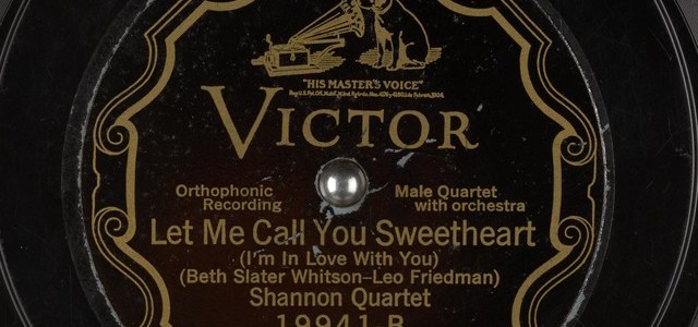 “Let Me Call You Sweetheart (I’m In Love With You)” (1926) from Let Me Call You Sweetheart (I’m In Love With You) by Shannon Quartet; Beth Slater Whitson; Leo Friedman (Track 1). [Archive.org]