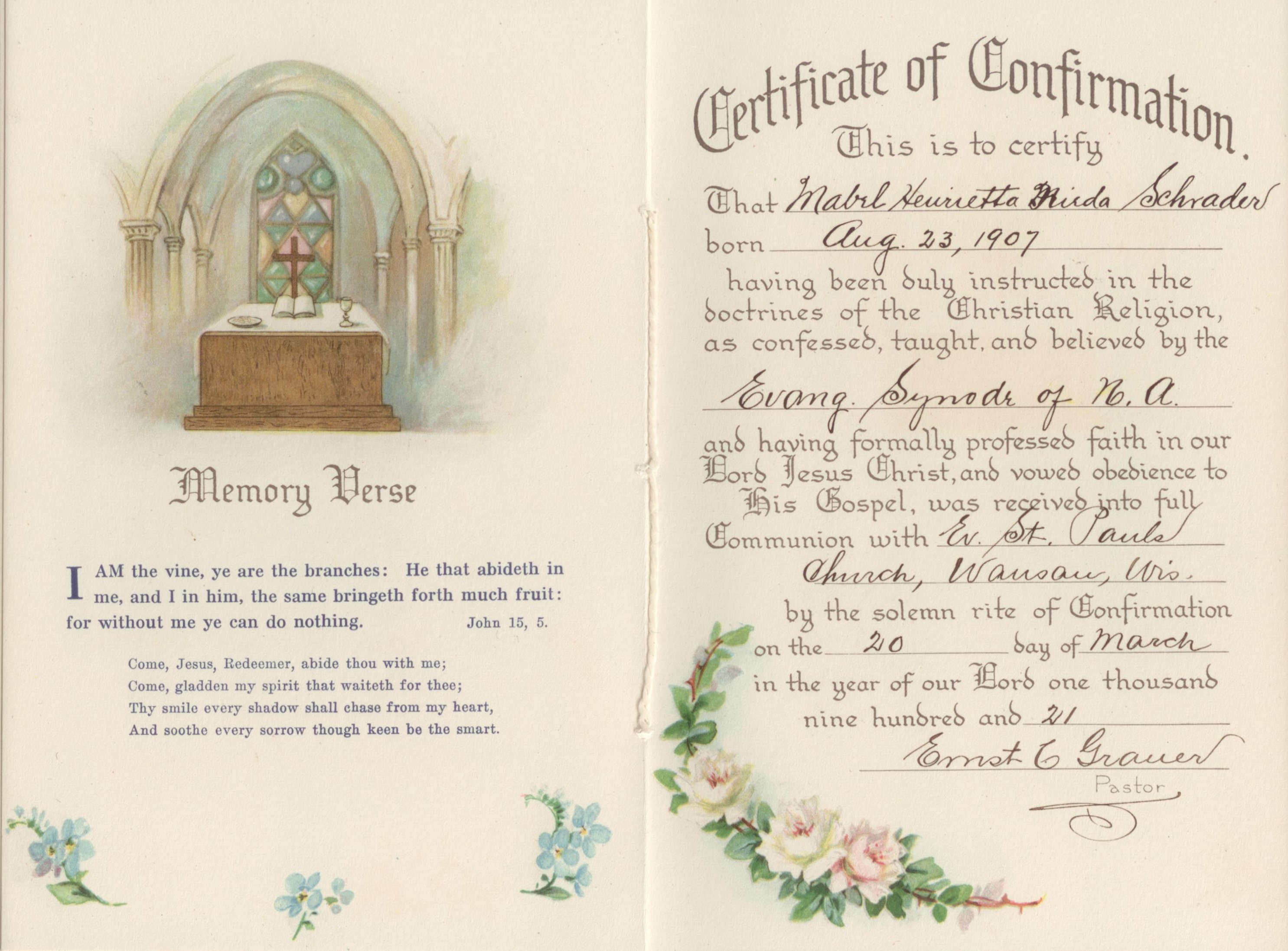 Confirmation: Mabel August 21, 2018September 13, 2018 ~ Krista Polansky St. Paul’s Evangelical Church – Wausau, WI – March 20, 1921 Confirmation – Mabel Henrietta Frieda Schrader – March 20, 1921 – Wausau, WI